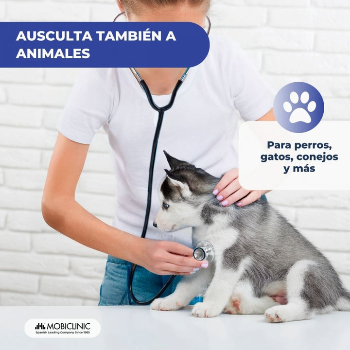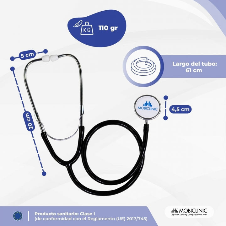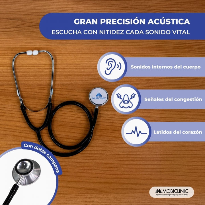 Estetoscópio de sino duplo em cor preta desenvolvido para auscultação. É um estetoscópio de alta qualidade para detetar fluxos sanguíneos anómalos nas artérias e veias e, assim, identificar possíveis complicações cardíacas ou pulmonares.