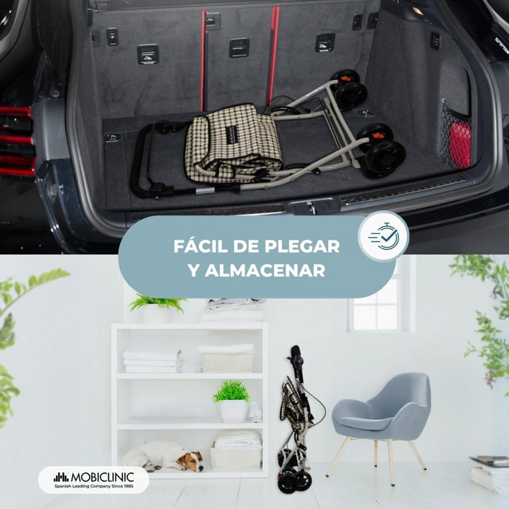Carrinho de compras andarilho | 4 rodas | Até 120kg | Dobrável | Com saco | Sistema de travagem | Quadro | Coliseo | Mobiclinic