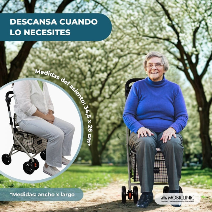 Além disso, este carrinho de compras dobrável tem um assento acolchoado, confortável e resistente para poder descansar durante o passeio ou enquanto espera em longas filas de espera no mercado. Tem também um encosto que lhe permite relaxar as costas e um saco de compras amovível, impermeável e lavável que pode conter até 5 kg. O carrinho de compras Coliseo é feito com uma só mão, permitindo que o utilizador o utilize com uma mão enquanto, por exemplo, passeia o neto ou o cão.