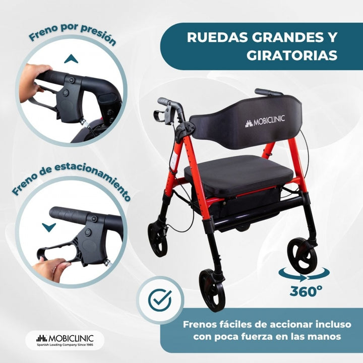 El sistema de plegado es rápido y sencillo: basta con accionar la barra situada bajo el asiento para compactar el andador y transportarlo o guardarlo sin esfuerzo. Sus ruedas delanteras giratorias 360º de 20,32 cm ofrecen gran maniobrabilidad, mientras que las ruedas desmontables permiten ahorrar espacio al almacenarlo.