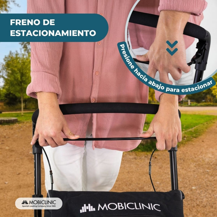 La seguridad está garantizada con su freno de estacionamiento, que mantiene el andador inmóvil cuando es necesario, ya sea al cocinar, conversar o detenerse en la calle.