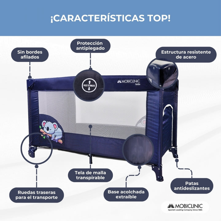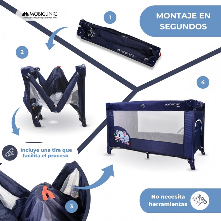 O berço portátil Mofli é composto por uma estrutura de aço resistente e um tecido respirável que permite a visão total do bebê, fácil de limpar com pano úmido. Funciona como cercadinho graças à sua altura fixa e ótima ventilação através da sua malha lateral. Além disso, a sua fácil dobragem permite que seja transportado para qualquer espaço sem problemas, se necessário. Também inclui uma base acolchoada removível.