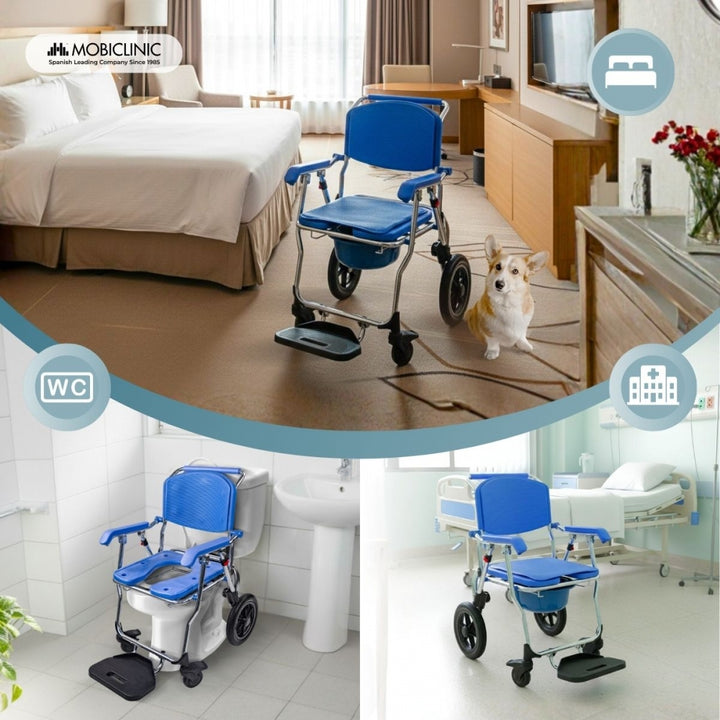 Seu design dobrável facilita o armazenamento e o transporte da cadeira. Ela pode ser guardada sem ocupar muito espaço e movida facilmente de um cômodo para outro, sendo ideal para casas de repouso, residências e hospitais. Sua estrutura foi projetada principalmente para facilitar as tarefas diárias, reduzindo movimentos bruscos e posturas inadequadas.
