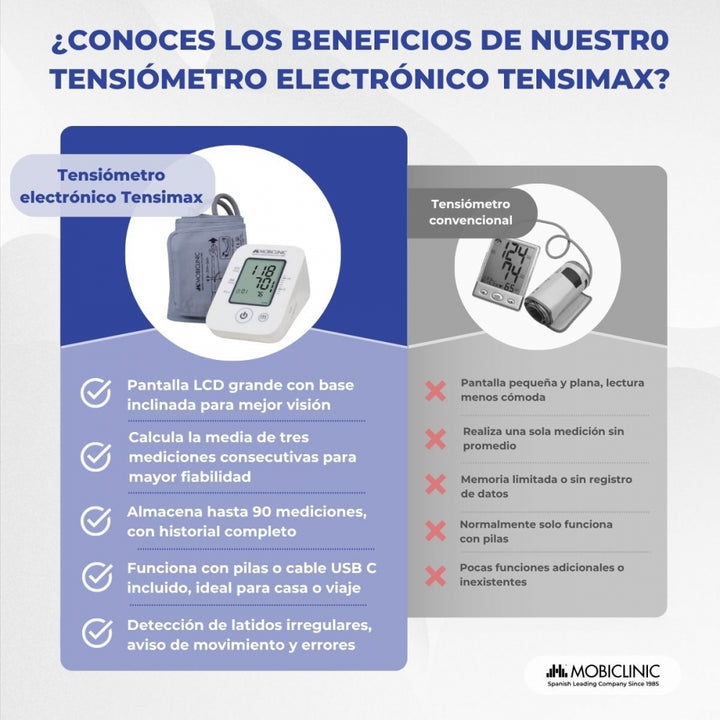 O monitor de pressão arterial de braço Tensimax oferece uma experiência abrangente, intuitiva e precisa para monitorar a pressão arterial em casa. Graças ao seu único botão central, é fácil de usar e acessível a qualquer usuário. Além disso, sua base inclinada com suporte melhora a visibilidade e permite uma leitura confortável dos resultados.