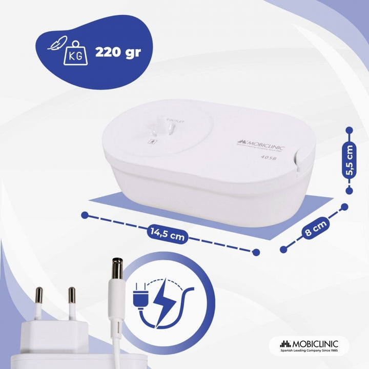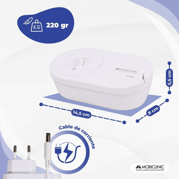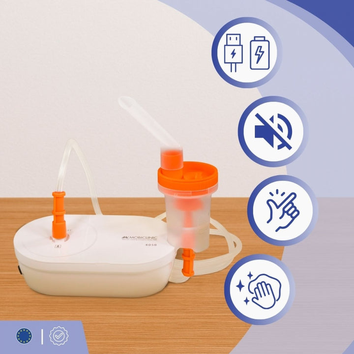 Seu design compacto e leve facilita o armazenamento e o transporte. Seu funcionamento é simples, conectando-se à rede via USB. Em relação à higiene, suas peças são fáceis de desmontar, facilitando a limpeza. O copo medidor e o bocal são desinfetados por fervura, enquanto as máscaras podem ser desinfetadas com álcool. O tubo de ar precisa apenas ser enxaguado e seco com um pano.