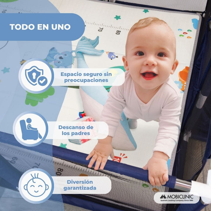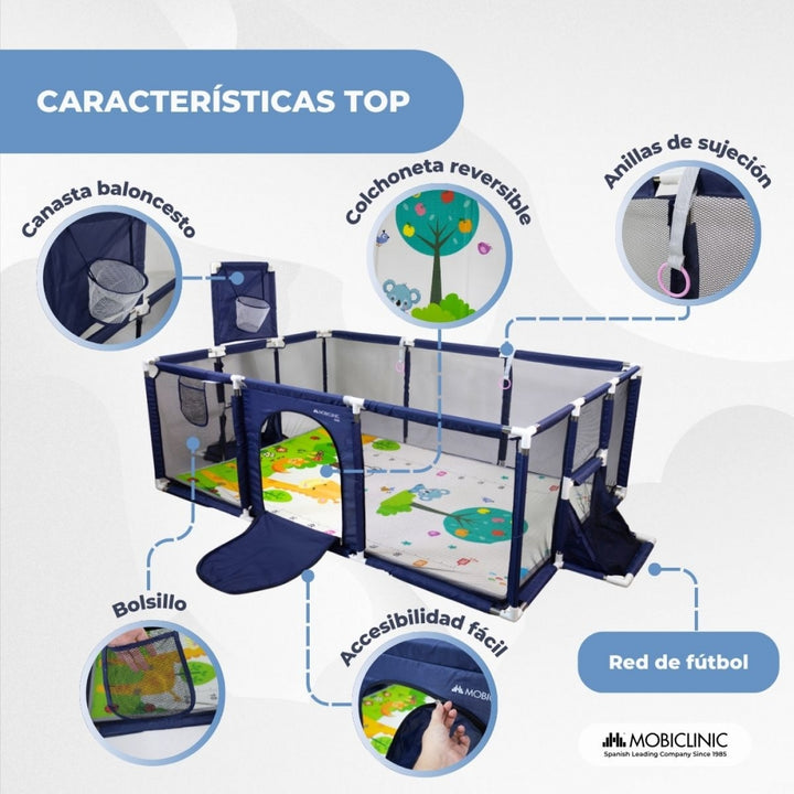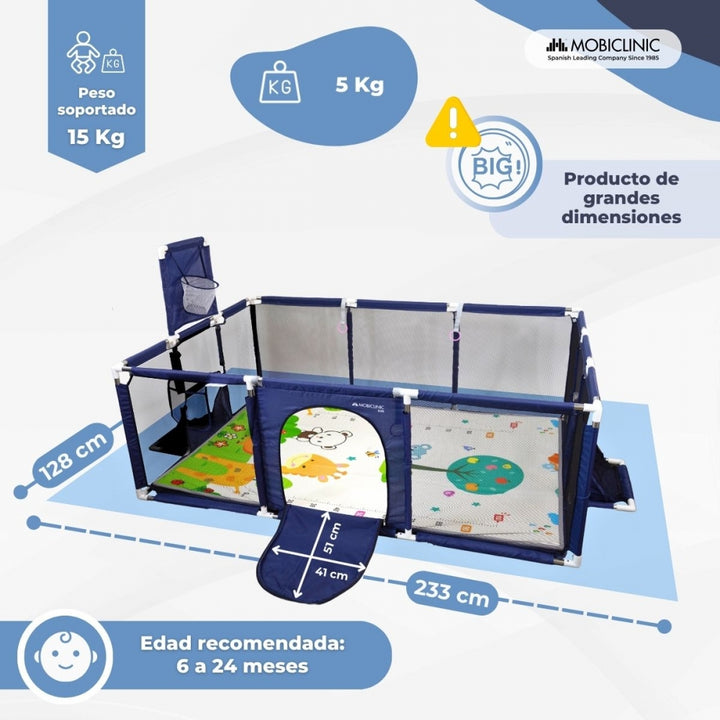 Graças às suas dimensões de 128 x 233 cm, oferece uma área de brincar ampla e confortável, onde o seu pequeno pode engatinhar, levantar, brincar ou praticar os primeiros passos com segurança. O tapete incluído também oferece uma superfície acolchoada que isola o piso e melhora a experiência de brincar ou descansar.