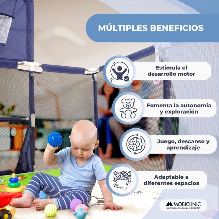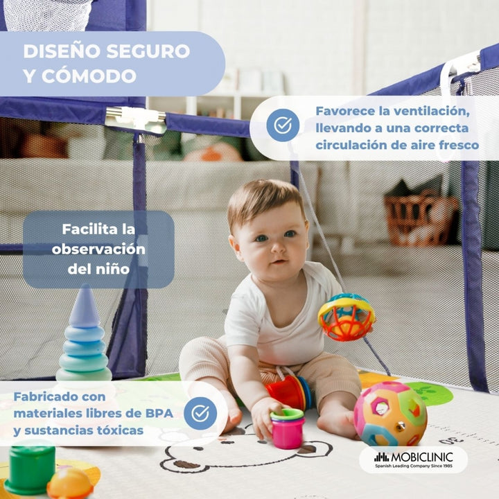 Para incentivar a independência e a coordenação dos pequenos, o cercadinho possui quatro argolas de segurança projetadas para ajudá-los a aprender a ficar em pé de forma gradual e segura. Suas paredes de malha respirável permitem que os pais monitorem o bebê o tempo todo e também garantem ventilação constante.