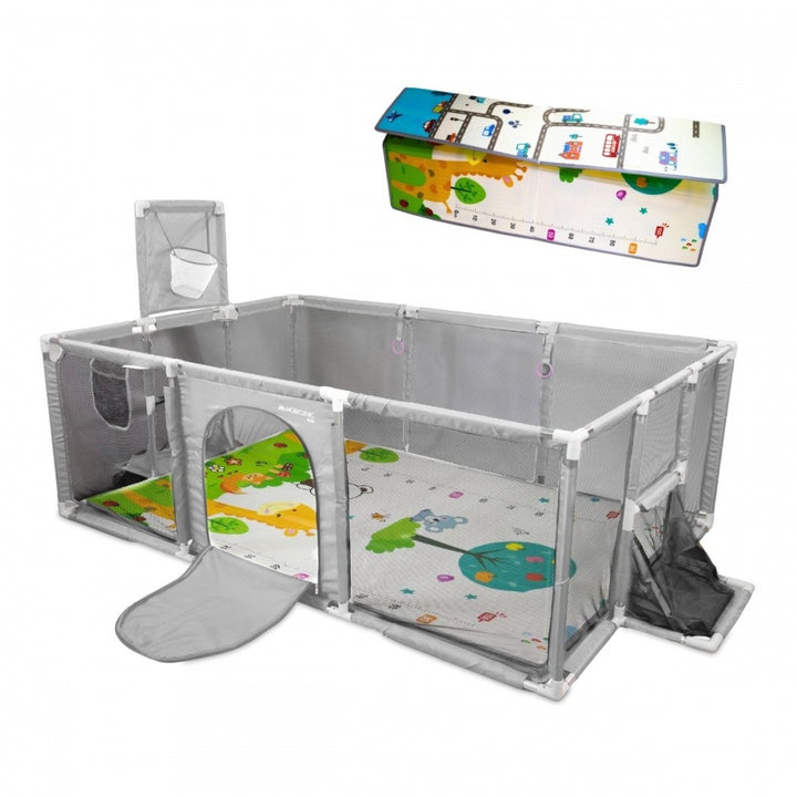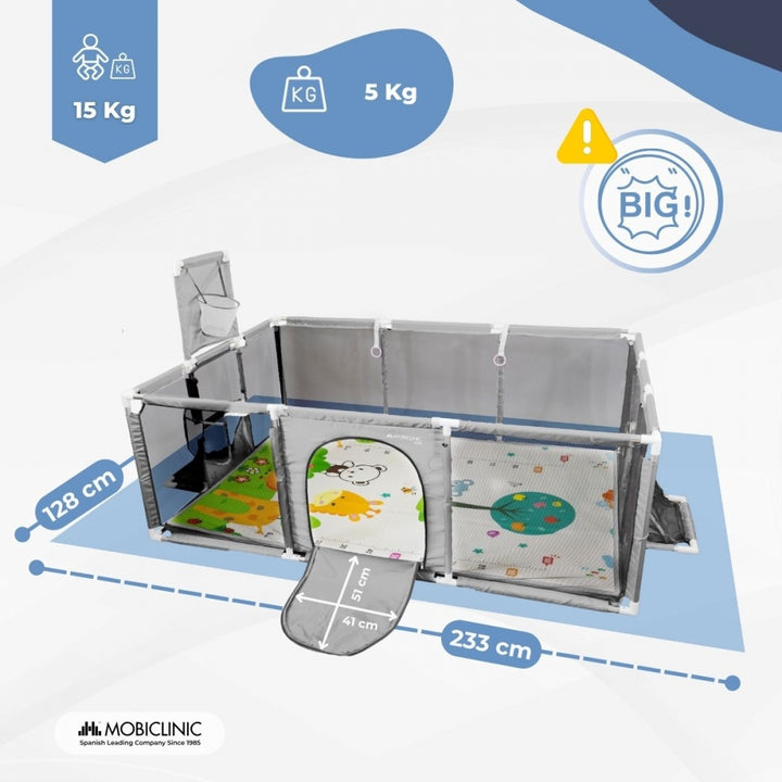 Graças às suas dimensões de 128 x 233 cm, oferece uma área de recreação espaçosa e confortável, onde os pequenos podem engatinhar, ficar de pé, brincar ou praticar os primeiros passos com segurança. O tapete incluso também oferece uma superfície acolchoada que isola o piso e aprimora a experiência de brincar ou descansar.