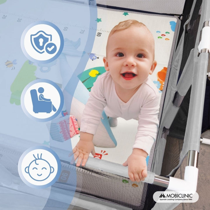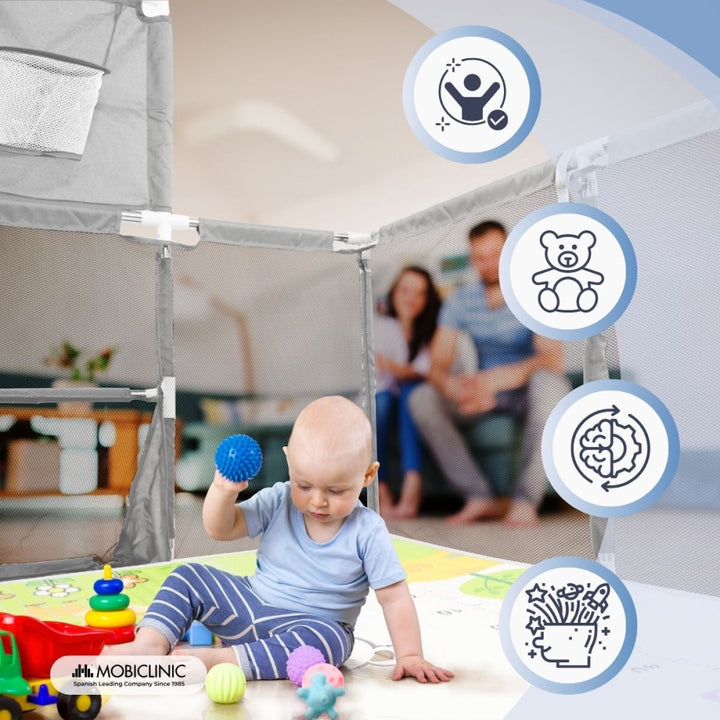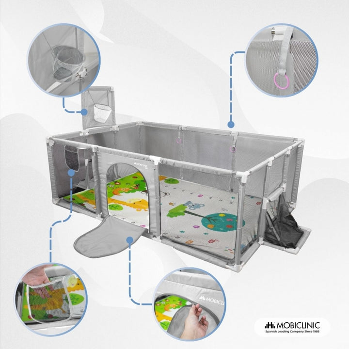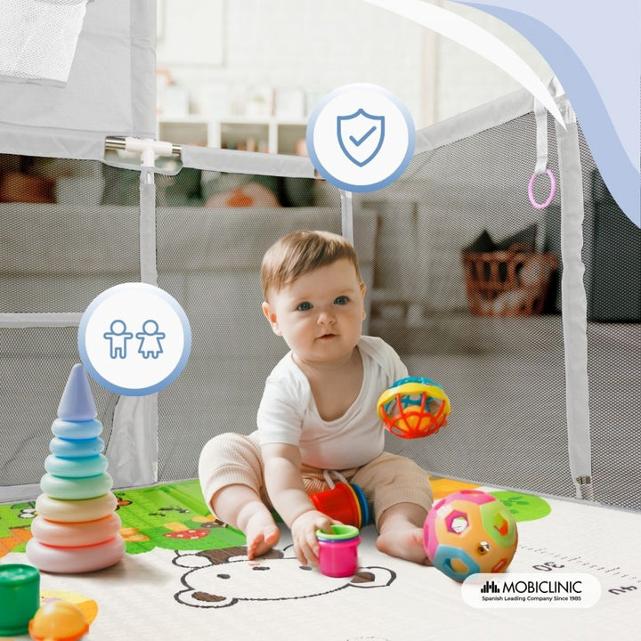 Para incentivar a independência e a coordenação dos pequenos, o cercadinho possui quatro argolas de segurança projetadas para ajudá-los a aprender a ficar em pé de forma gradual e segura. Suas paredes de malha respirável permitem que os pais monitorem o bebê o tempo todo e também garantem ventilação constante.